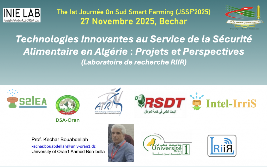 Nov. 27th, 2025. Professor Bouabdellah Kechar, director of the RIIR laboratory and scientific leader of the INTEL-IRRIS UORAN1 team, presented a plenary lecture during the “1st Day On South Smart Farming (JSSF’2025)” in Béchar on November 27, 2025. His presentation, entitled “Innovative technologies at the service of food security in Algeria: projects and perspectives”, provided a complete overview of the field, including completed (INTEL-IRRIS, PNR S2IEA), ongoing and future projects.